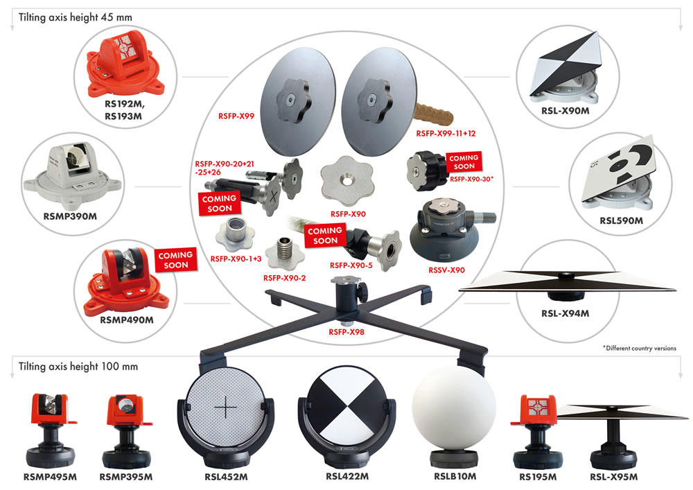 The illustration below shows all the products that can be used with the RSFP-X90 fixed point. Magnets in the base plate hold the reflective target or mini prism precisely on the desired spot.